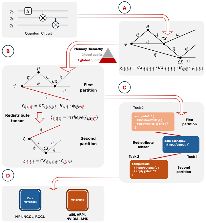 Simulating quantum circuits (QC) on high-performance computing (HPC) systems has become an essential method to benchmark algorithms and probe the potential of large-scale quantum computation despite the limitations of current quantum hardware. However, these simulations often require large amounts of resources, necessitating the use of large clusters with thousands of compute nodes and large memory footprints. In this work, we introduce an end-to-end framework that provides an efficient partitioning scheme for large-scale QCs alongside a flexible code generator to offer a portable solution that minimizes data movement between compute nodes. By formulating the distribution of quantum states and circuits as a graph problem, we apply closeness centrality to assess gate importance and design a fast, scalable partitioning method. The resulting partitions are compiled into highly optimized codes that run seamlessly on a wide range of supercomputers, providing critical insights into the performance and scalability of quantum algorithm simulations.